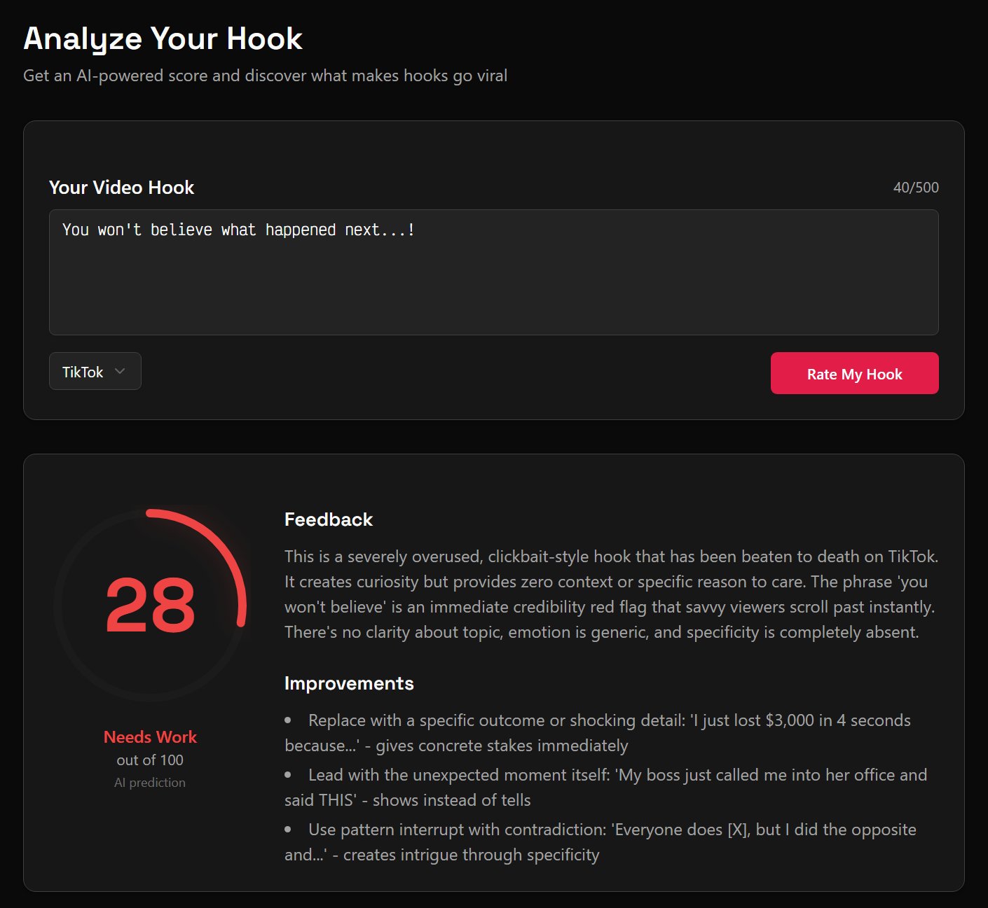 - Viewer Retention Insights: Understand why hooks fail, with detailed feedback on viewer retention.