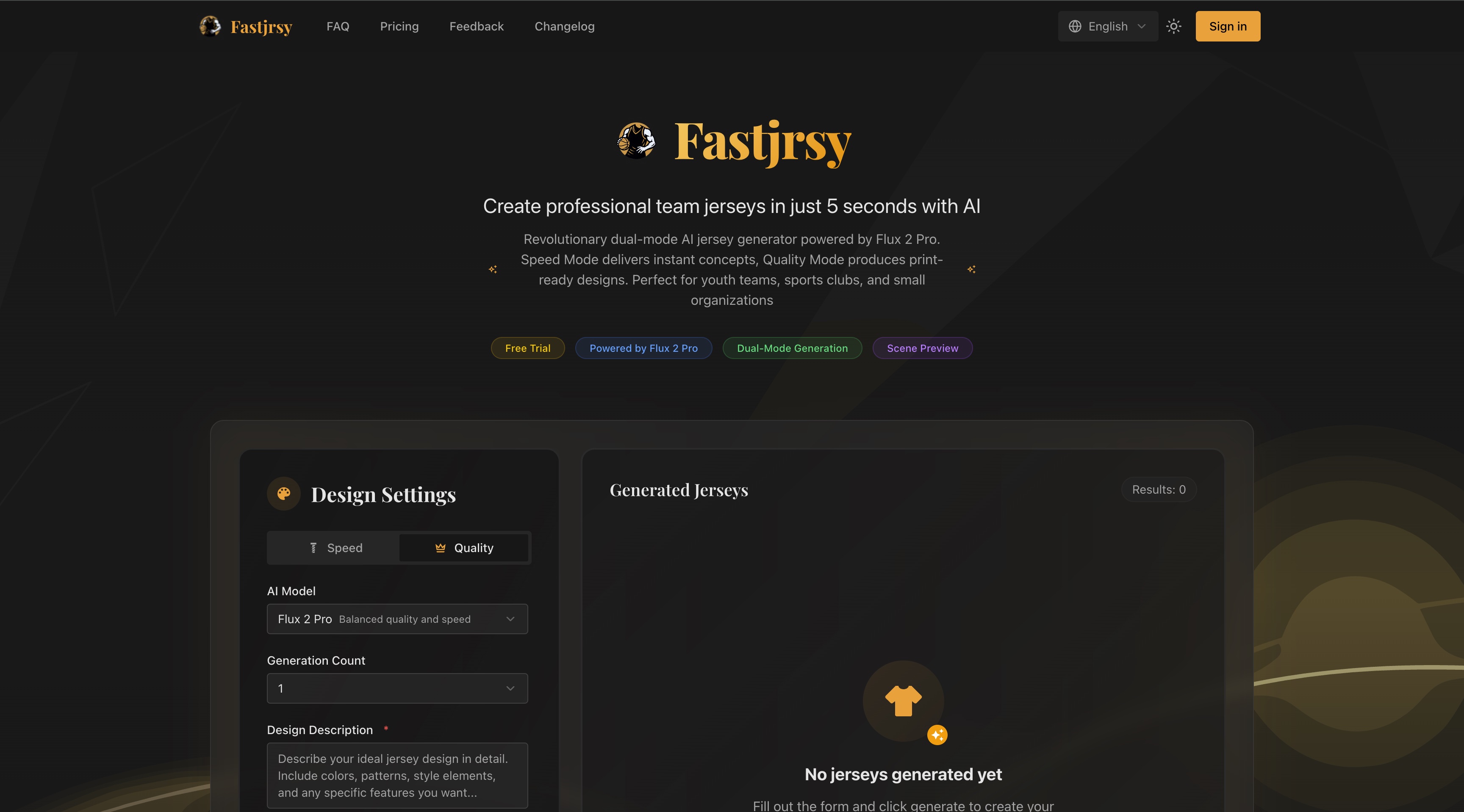Dual-mode AI jersey generator: Speed Mode for concepts validation, Quality Mode for pro output. Flux 2 Pro powered, perfect for small teams.