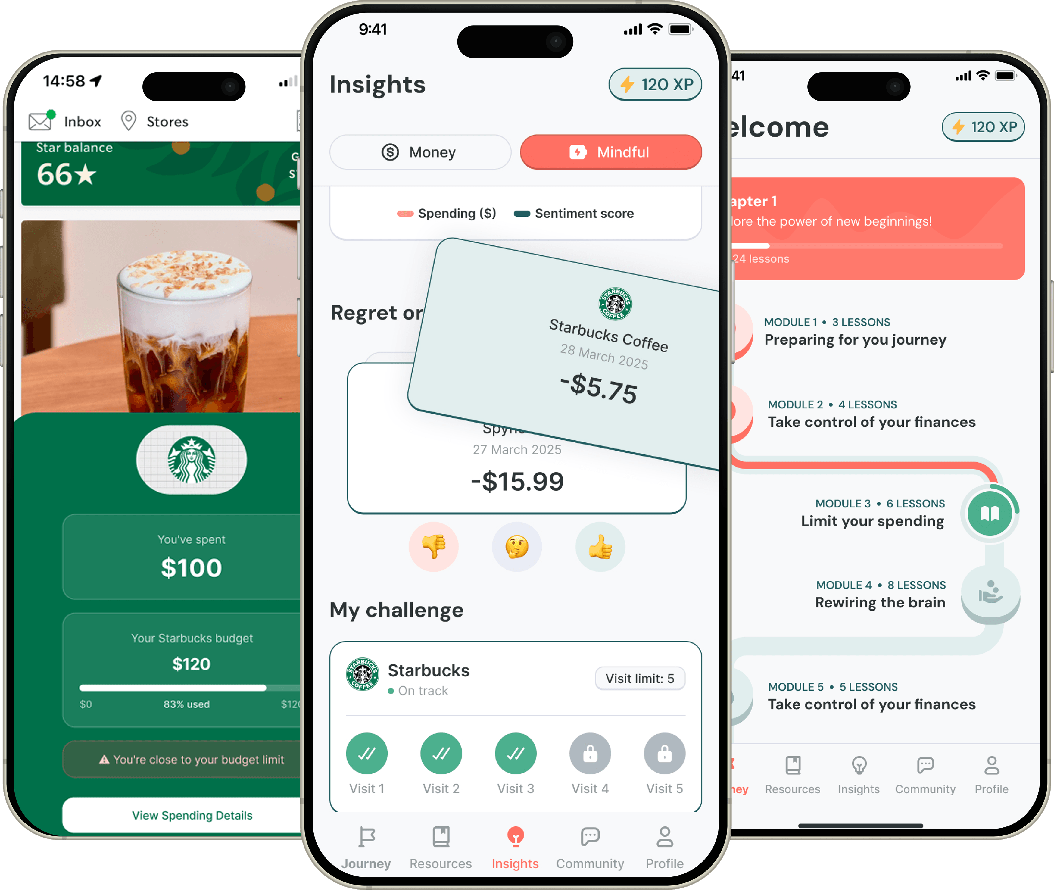 Gamification — XP system, daily streaks, achievements, and module progress. The same dopamine loop that drives impulse spending starts working for you instead of against you.