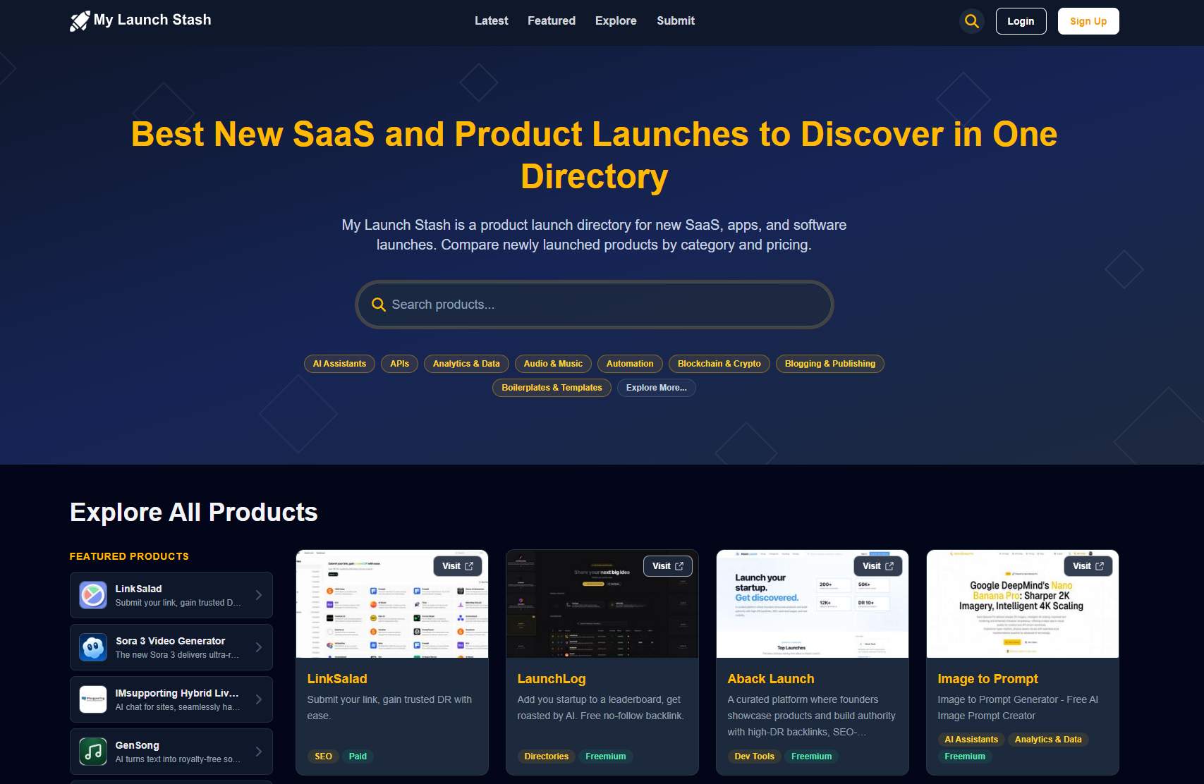 New Product Launches Worth Saving, Tracking, and Comparing Explore All Products Featured products About My Launch Stash Frequently Asked Questions Explore Products by Category My Launch Stash is a product launch directory for SaaS launches, app launches, and early-stage software releases.
