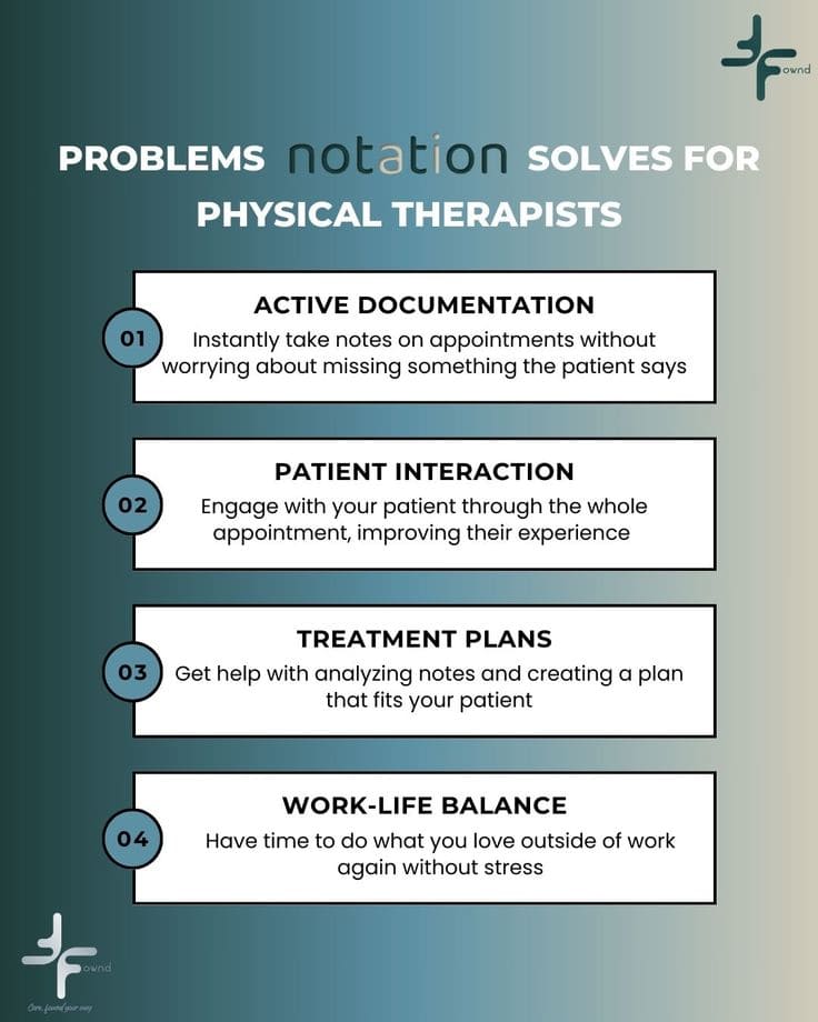 FOWND delivers live, compliant SOAP notes during sessions—built for PT workflows, reducing admin time and improving care.
