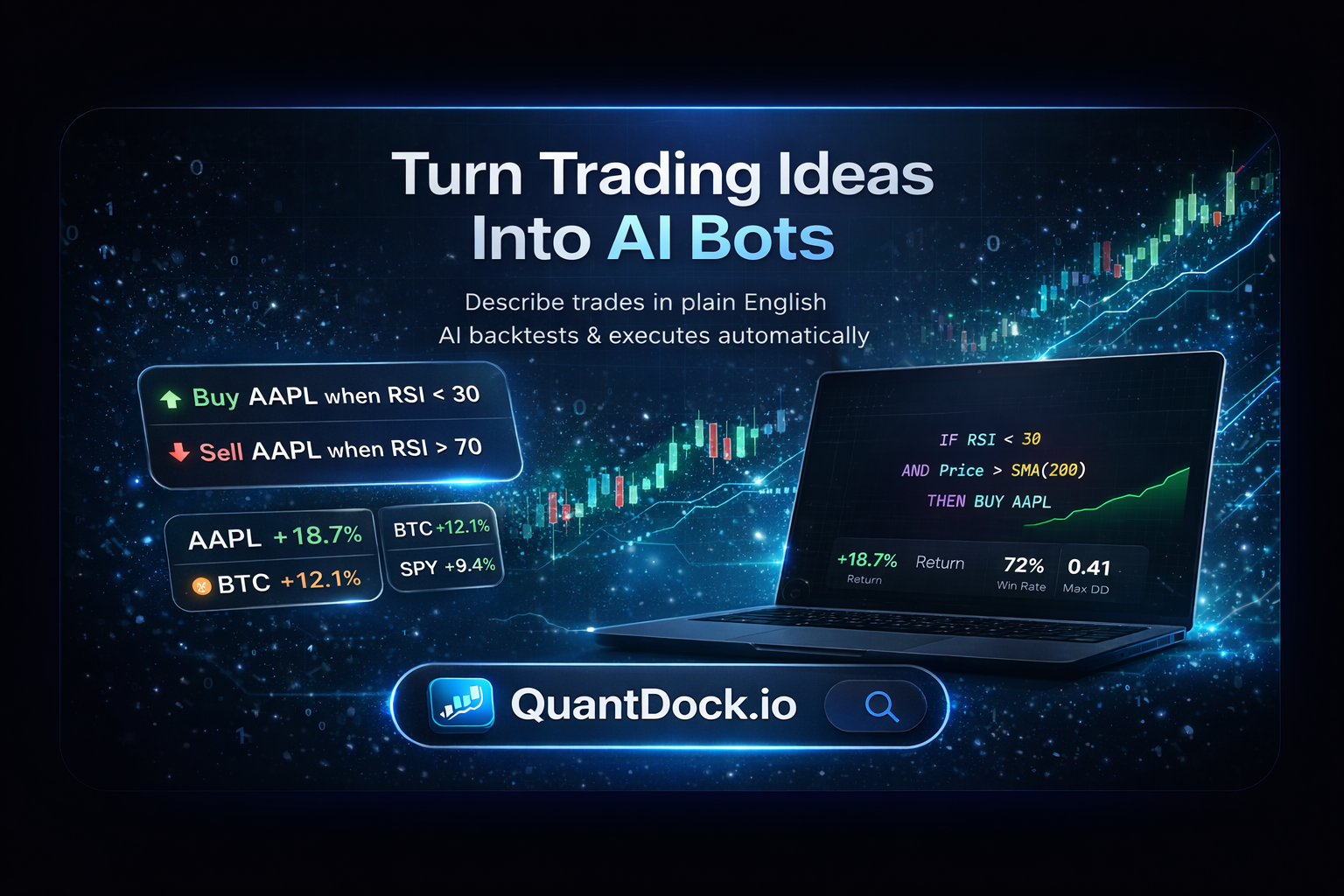 QuantDock is an AI-powered trading platform that turns plain-English trading ideas into fully automated trading strategies. Instead of writing complex code or learning algorithmic trading frameworks, users simply describe a trading idea in natural language. For example, a user might say: “Buy AAPL when it dips 5% from its recent highs and sell at a 5% profit.” QuantDock interprets this description, converts it into structured trading logic, runs historical backtests to evaluate performance, and prepares the strategy for automated execution.