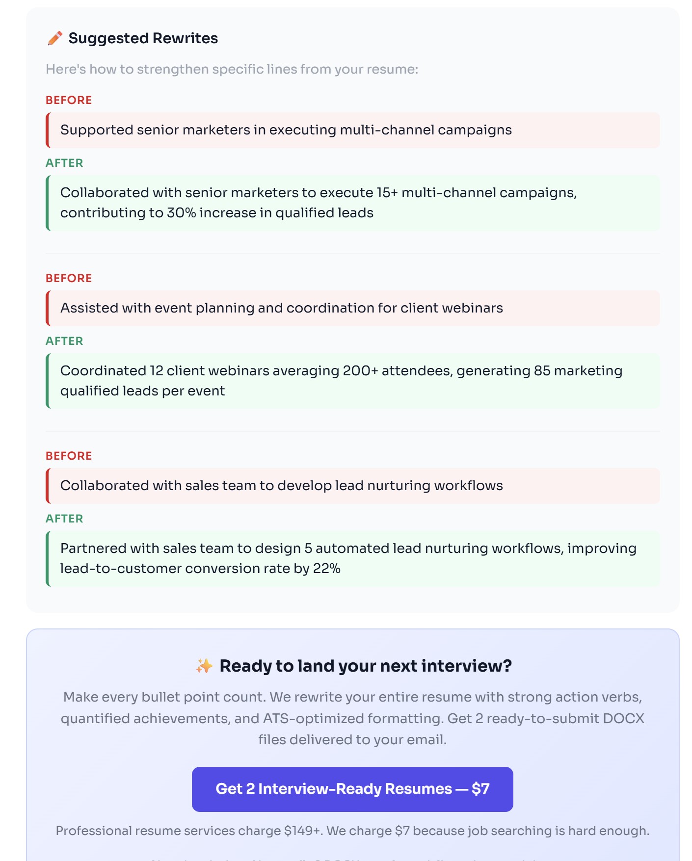 What Your Score Means Three steps to a stronger application Every angle of your application, scored Beyond Keyword Matching See the Difference Good Bullets Make What Our Users Say Land the interview with your next application.