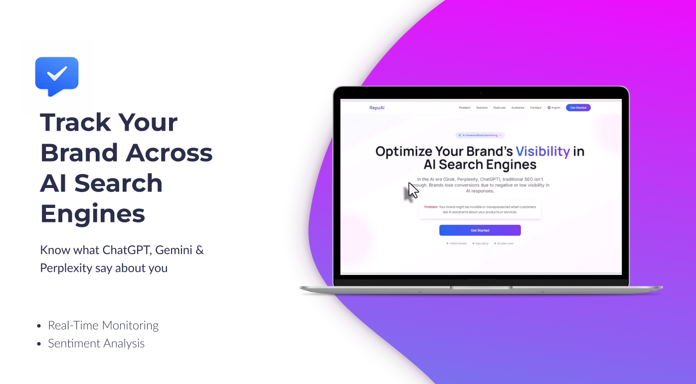 Monitor and optimize your brand in AI search engines like ChatGPT, Perplexity, and Grok. Track visibility and improve your AI presence. See How AI Sees Your Website The AI Search Challenge Your Free AI Visibility Score — Right Now Who Benefits from RepuAI Track and optimize your presence in ChatGPT, Perplexity, Gemini and other AI search engines.