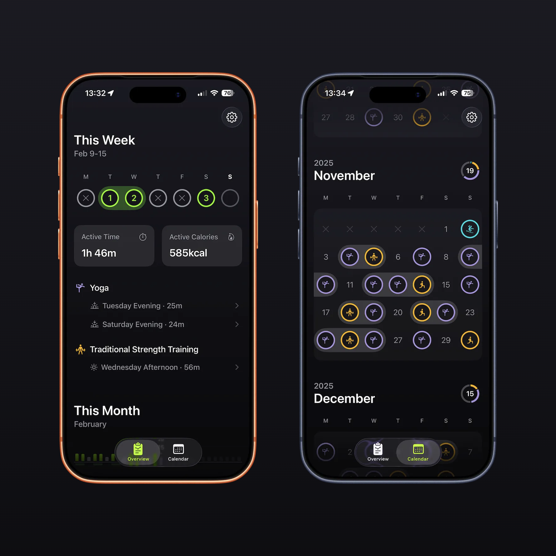 ** Calendar Your workout history, visualized in a calendar feed to paint the big picture. Features monthly summary charts, category-based color coding of workouts, and streak highlighting. Scroll through your training timeline to discover patterns and stay motivated.